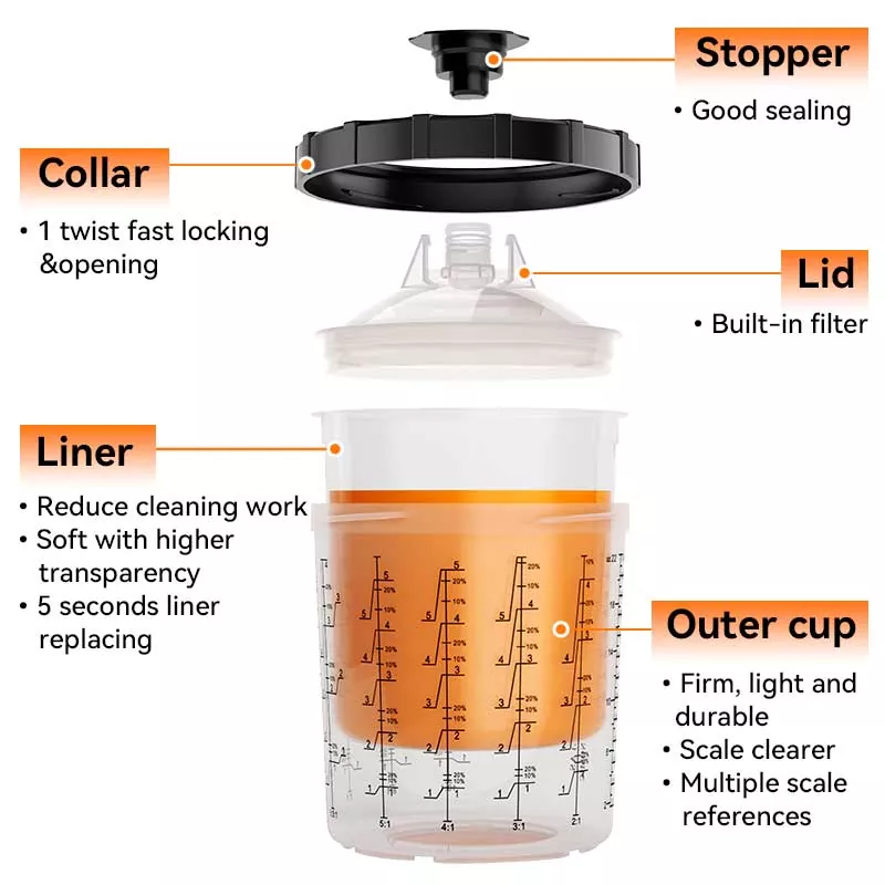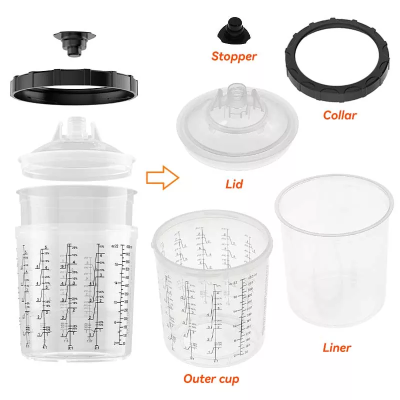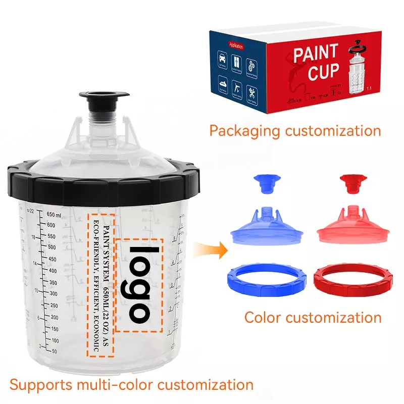 600ML botatzeko pinturako kopa sistema da, 22 FL oz edo gutxiagoko materialen sprayd.ayspat-ek diseinatzen dituena. Zure beharretarako diseinuak eskaintzen dizkizu eta zure beharrak asetzeko ere pertsonaliza daiteke: kanpoko kopa zure marka logotipoarekin eta eskalarekin pertsonaliza daiteke, eta tapa kolorearekin eta iragazki motarekin pertsonaliza daiteke. Spray Cup-eko sistema eraginkorragoak eta erosoagoak garatzeko konpromisoa hartzen dugu, margolariak profesionalki eta modu eraginkorrean lan egiten laguntzeko.