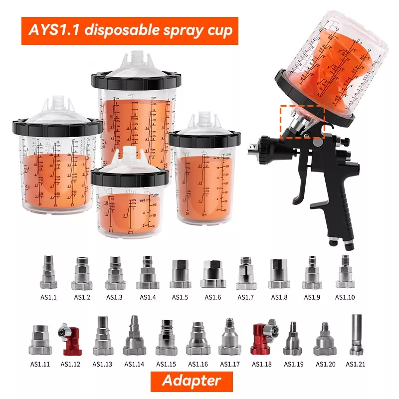 AYS1.1 botatzeko spray kopa PPS1.0 serie egokitzailearekin bateragarria da. Egokitzailearekin, ezin hobeto egokitu daiteke spray pistola edozein markara eta edozein posiziotan erabil daiteke pintura tantak egiteko arriskurik gabe.