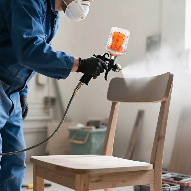 Altzarien eta egurrezko egitura irregularrak spray pistola maiz okertzea eskatzen du spraying garaian. Ayspat botatzeko pintura kopa 360 ° biratzen da isurketa egitean, pintura tantak saihesteko, eta estalkia behin eta berriz okertu daiteke norabide askotan spraying angelu desberdinak hartzeko. Pu / NC pintura zurezko ateetan, armairuetan eta egurrezko altzarietan isurtzeko aproposa da.