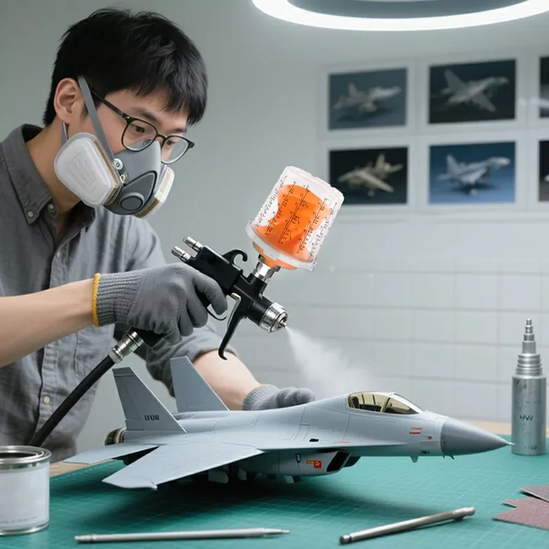 400 ml botatzeko spray pistola kopa arina eta erosoa da, mini spray pistolekin erabiltzeko ezin hobea. Kolore bizkorreko aldaketa funtzioa kolore konplexuak eta askotarikoak dituzten modeloak margotzeko aproposa da. Ayspat botatzeko spray koparen isurketa zehatzak ereduak margotzeko kalitatea hobetzen du, eredu militarrak, GK zifrak eta horma-irudiak margotzeko aproposa bihurtuz.