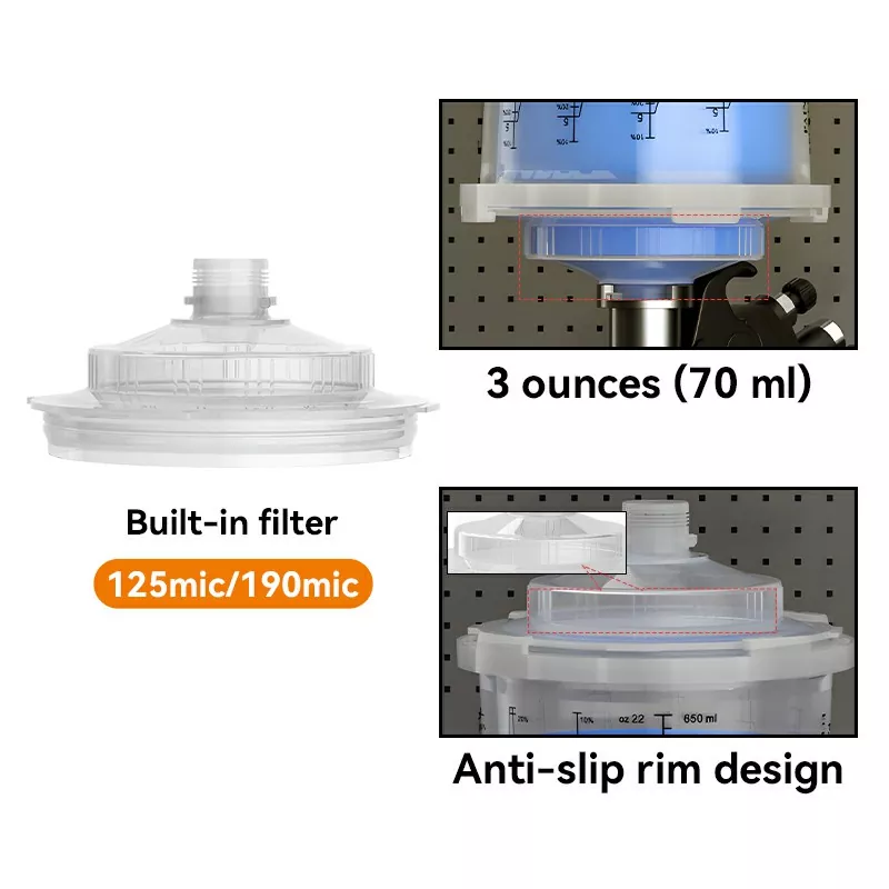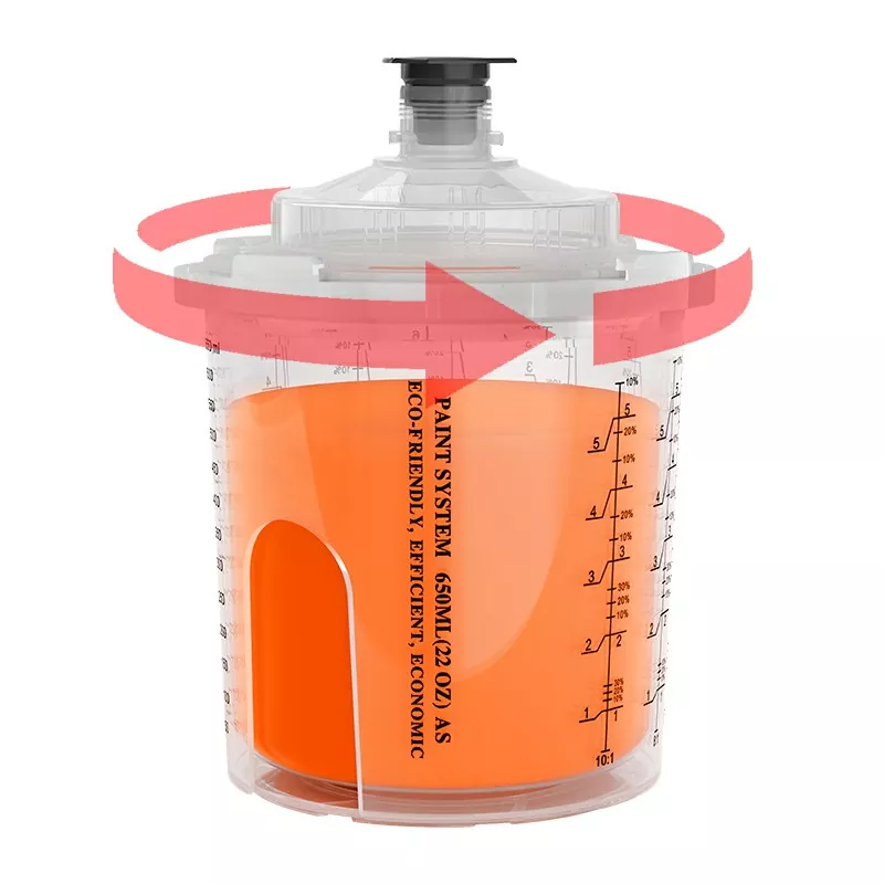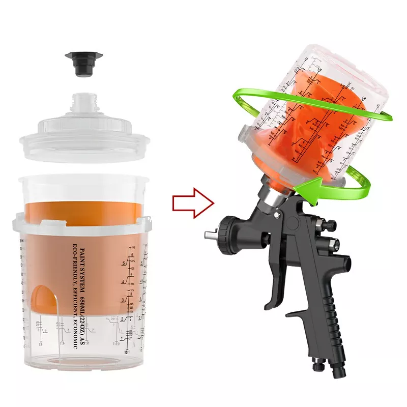 650ml botatzeko spray pistola kopa kanpoko diseinu integratua dago kanpoko kopa ertzean. Estalkiak kanpoko kopan blokeatzen du bihurrituz 1/4 erloju orratzen, barruko kopa aldatzeko behar den denbora murriztuz. Horrek kolore anitzeko isurketarako bereziki egokiak dira, pintura kolorearen aldaketa eraginkortasuna hobetuz. Lepo gabeko diseinuak, gainera, Kopa ez da erabili ezinezkoa da galdutako lepokoa dela eta.