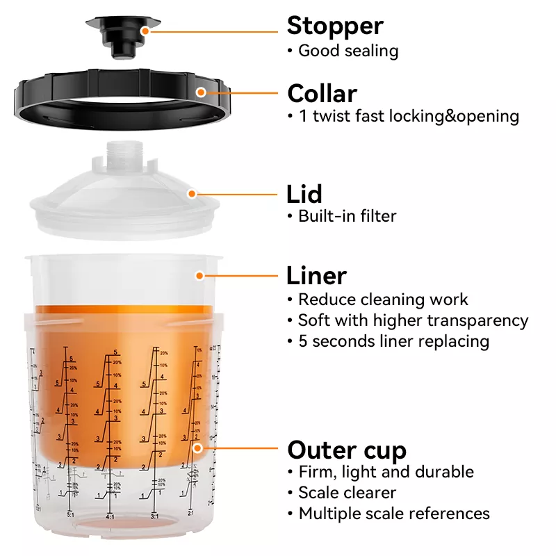 850ML Speedy Paint System 2.0 batez ere automobilgintzako ihinztaketa profesionaletan eta ihinztaketa industrialetan erabiltzen eta hornitzen da. 20 egokitzaile mota baino gehiago eman ditzakegu, funtsean, merkatuan dauden spray-pistolen marka guztiak asetzeko. Produktuari dagokionez, 80, 125 eta 190 mikroko iragazkiak eman ditzakegu, eta estalkiak eta estalkiak UVaren aurkako tratamendua ere egin dezakete pintura oso berezi batzuen ihinztadura eta kontserbazioa asetzeko. Margoketa amaitu ondoren, erabili gabeko pintura pintura edalontzien sisteman gorde daiteke hurrengo erabilerarako. Pintura lehortu eta iragazkia oztopatu ez dadin, tapoi batekin zigilatzea gomendatzen dugu edalontzi-sistema goitik behera gorde aurretik. Azkenik, spray pintura zaleak ongi etorriak dira gure produktuei buruz galdetzera etortzera!