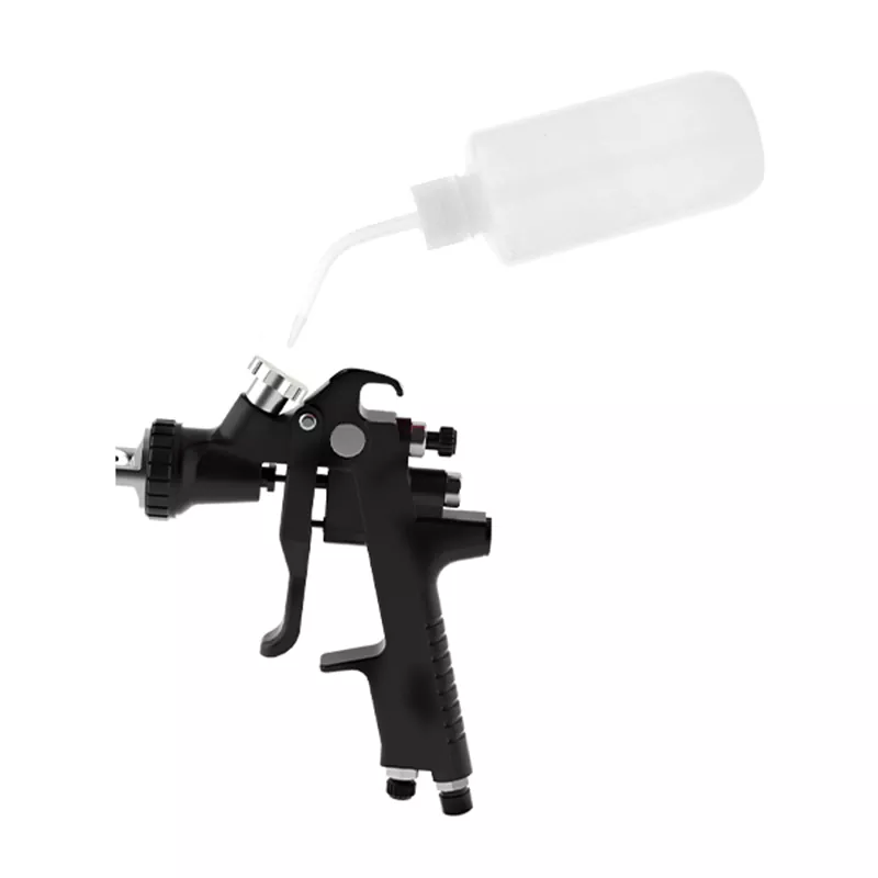 Spray pistaren garbiketa botilaren tobera kurba paregabeak spray pistolaren barruan hondakinen pintura azkar hustu dezake, eta horrek eraginkortasunez saihestu dezake pintura lehortzeak eragindako blokeoa, spractaren pistolaren zerbitzua zabaltzea eta minimizatzea spray pistola garbitzeko denbora gutxiesteko.